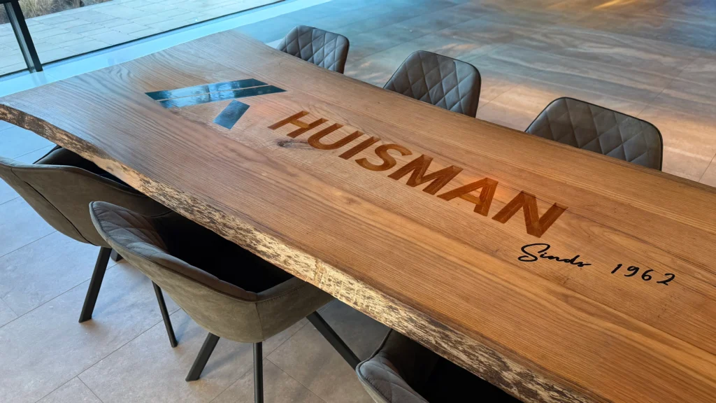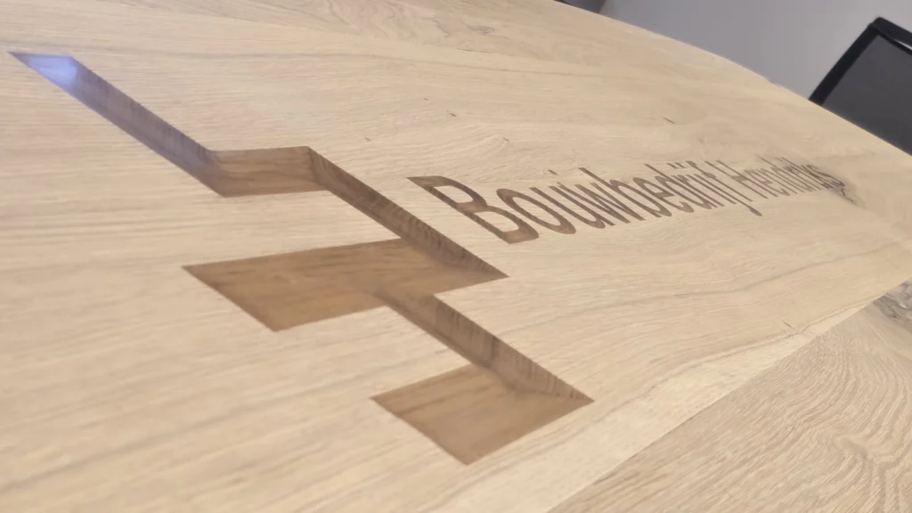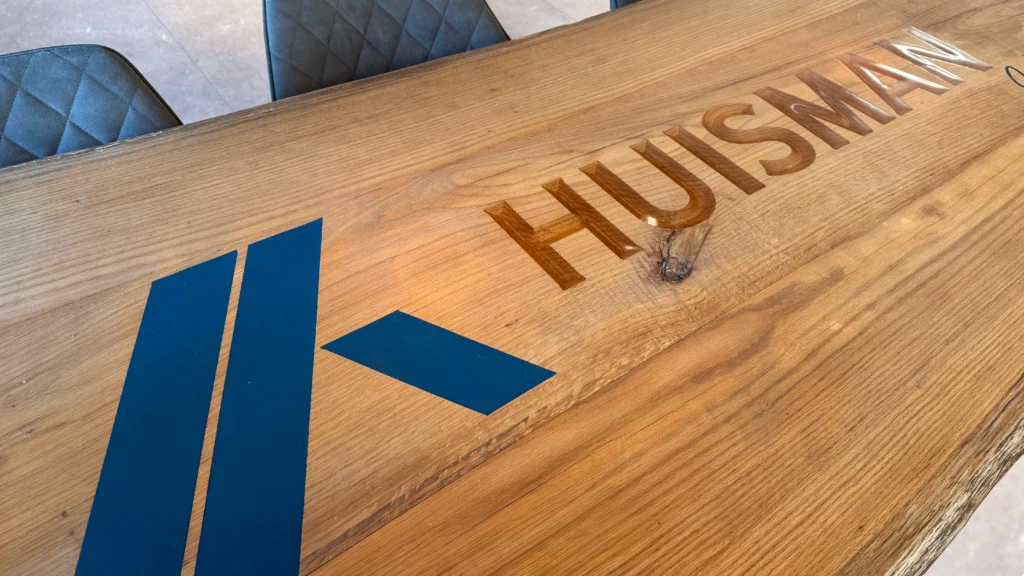 Een subtiel of juist opvallend epoxylogo in uw tafelblad maakt uw vergaderruimte direct onderscheidend. Het straalt professionaliteit en trots uit – en laat een blijvende indruk achter bij klanten en partners. Naast epoxy kunnen we uw logo ook inleggen met een andere houtsoort.